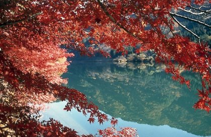 Kuguru significa «pasar por abajo» y crea la imagen de aguas azules fluyendo bajo una capa de hojas de otoño. Si en su lugar leemos kukuru, «anudar», connota una técnica de tintura textil en la que se hacen nudos a la tela antes de sumergirla. Esta técnica se utilizaba para crear diseños en azul y rojo, tal como el río Tatsuta en otoño.